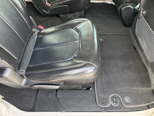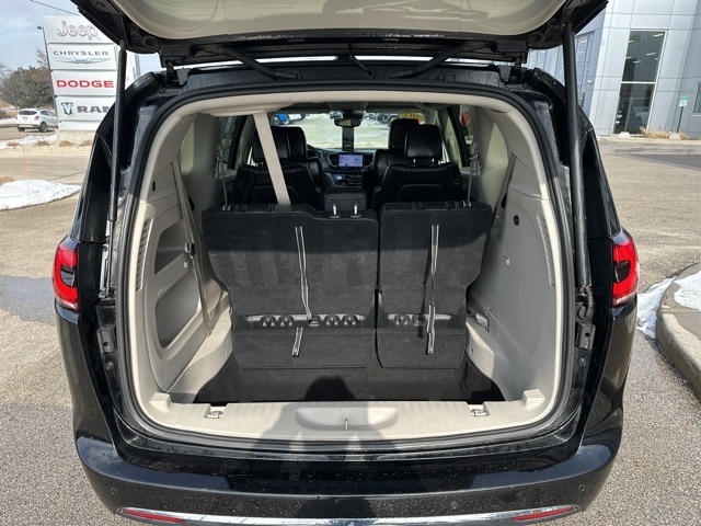 Inside, it features Caprice leatherette bucket seats with heated front cushions and seatbacks, along with a heated TechnoLeather-wrapped steering wheel and a power liftgate release. The Uconnect 5 system is displayed on a 10.1-inch touchscreen and includes Apple CarPlay, Google Android Auto, integrated voice command, USB connectivity, and streaming audio through a six-speaker sound system with active noise cancellation. Adaptive cruise control with stop and go, dual-zone climate control with rear auxiliary heating, keyless entry with push-button start, and power sliding rear doors add everyday convenience. The cabin also includes a driver information center, conversation mirror, illuminated cupholders, multiple storage compartments, carpeted flooring, and a tilt/telescoping steering column.