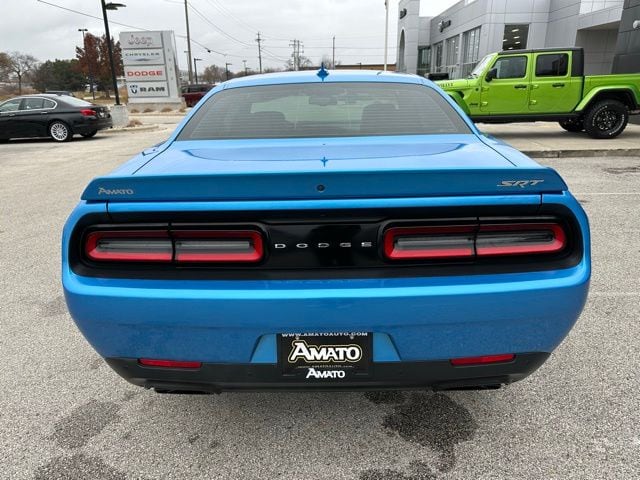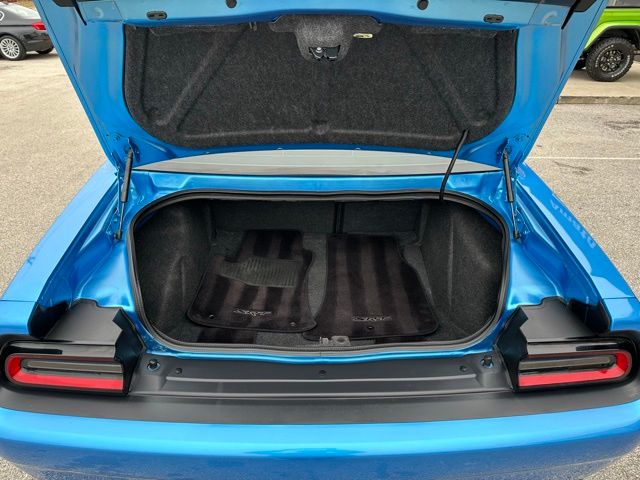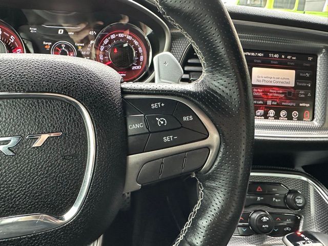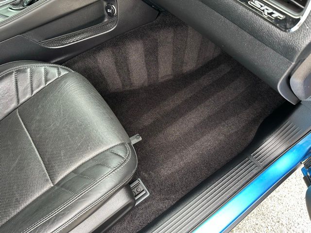Inside, the Challenger SRT Hellcat exudes a blend of race-inspired precision and premium refinement. The Black Laguna leather performance seats, embossed with the SRT logo, offer both luxury and support, complemented by heated and ventilated front seats and a heated flat-bottom steering wheel. A driver-focused cockpit features the Uconnect 8.4-inch touchscreen with navigation, SiriusXM, and full smartphone integration, placing entertainment and performance data within easy reach. Subtle details like the metal-look accents, auto-dimming rearview mirror, and dual-zone automatic climate control elevate the in-cabin experience.