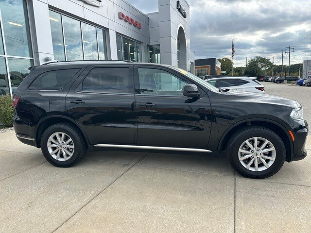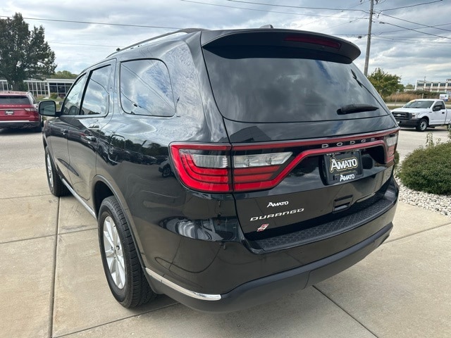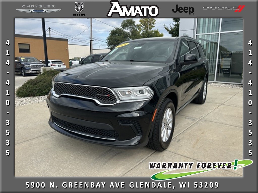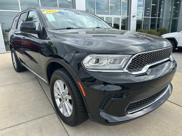 The 2023 Dodge Durango SXT AWD is a bold and capable SUV designed for both family adventures and everyday driving. Featuring a DB Black Clearcoat exterior with a sleek Black interior, this Durango combines aggressive styling with practical features such as body-colored bumpers, chrome accents, a power liftgate, deep tinted windows, and roof rail crossbars.