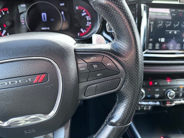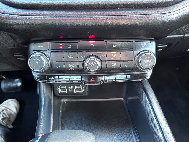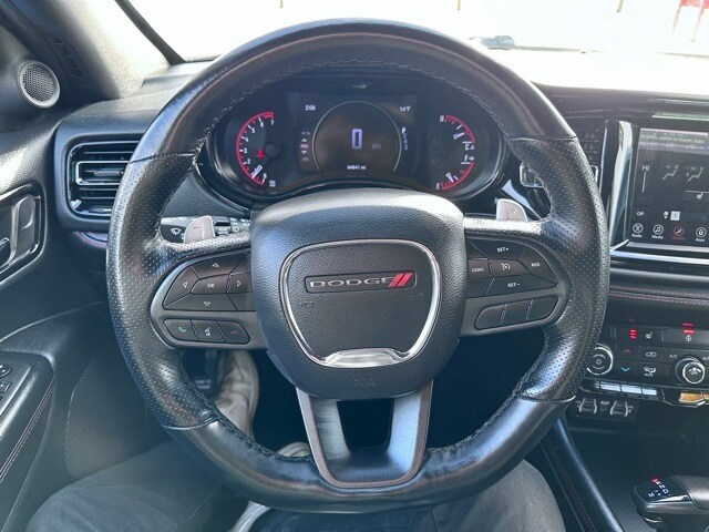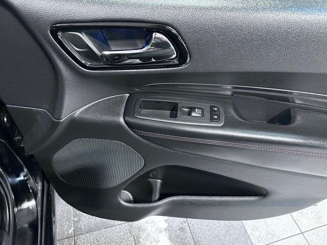 The exterior presents a bold and athletic look with LED low- and high-beam headlights, LED brakelights, a black grille, gloss black heated power mirrors, body-colored bumpers and door handles, deep-tinted glass, a rear lip spoiler, and a power liftgate for added convenience. Riding on 20-inch fine silver wheels with all-season tires, this Durango also includes perimeter approach lighting, laminated glass, a rear window wiper and defroster, and a compact spare tire stored underbody.