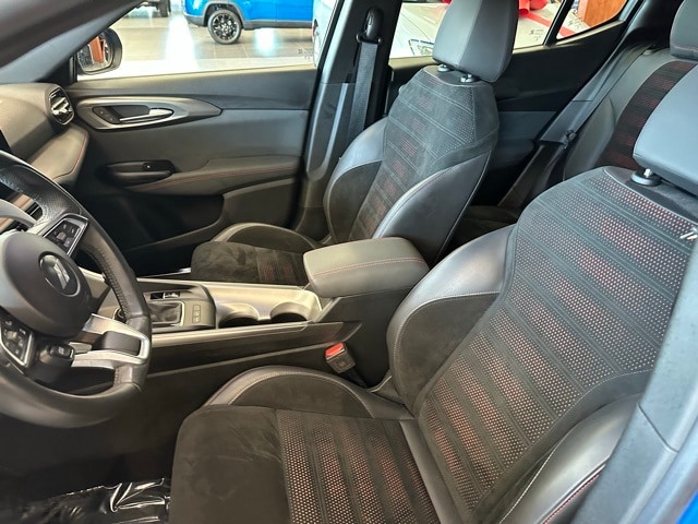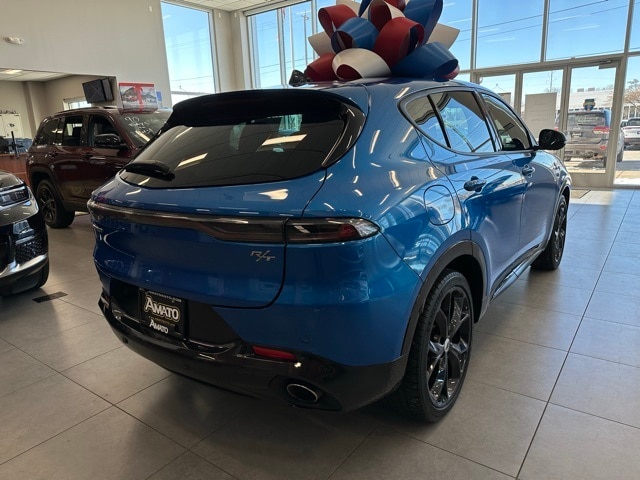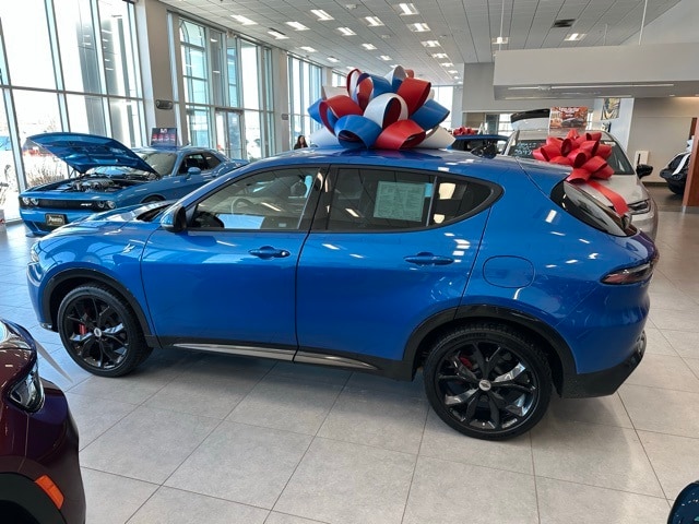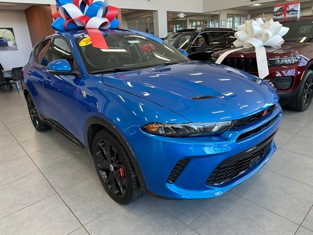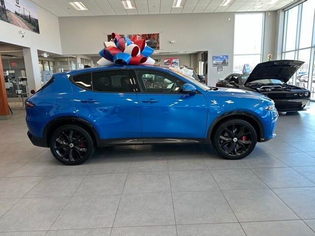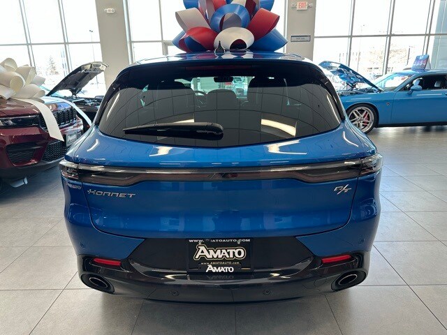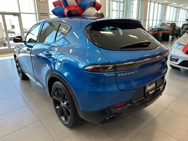 The 2024 Dodge Hornet R/T in Blu Bayou delivers a bold blend of performance, style, and modern hybrid capability. Its aggressive stance is enhanced by the Track Pack, featuring 20-inch Abyss-finish aluminum wheels, red brake calipers, bright pedals, and Alcantara seats with red accents. LED lighting, body-colored mirrors with turn indicators, and black exterior trim pieces give this Hornet a sharp, athletic presence from every angle. With AWD and a sporty exterior design, it stands out as one of the most dynamic compact hybrids on the road.
