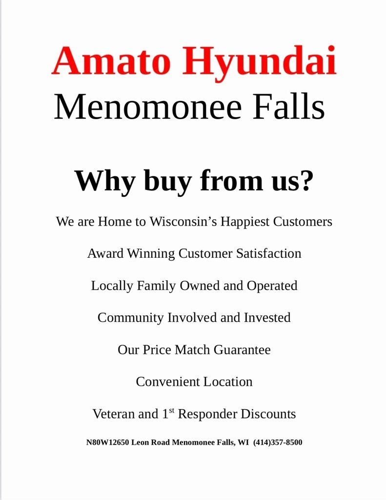 You deserve the best! John Amato Hyundai in Menomonee Falls has the highest customer satisfaction scores in the area! We do it by offering transparent pricing and an easy sales experience. Our top rated staff will do whatever we can to get you into your new Hyundai. Before you decide to buy a new Hyundai from any other store, let us show you what we can do! We proudly serve all Menomonee Falls, Germantown, Mequon, Thiensville, Cedarburg, Richfield, Hubertus, Sussex, Lisbon, Butler, Oconomowoc, Pewaukee, Brookfield, Elm Grove, Wauwatosa, Milwaukee, Waukesha, West Allis, Greenfield, West Bend, Slinger, Hartford, Delafield, Fond du Lac, and every town in between!