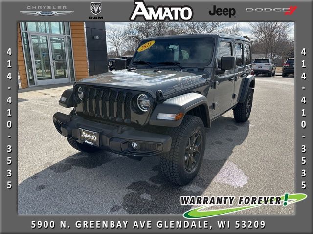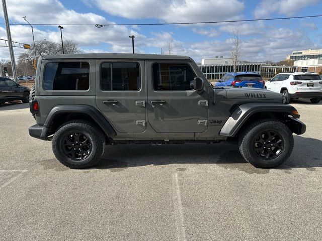 This 2021 Jeep Wrangler Unlimited Willys 4x4 is finished in Sting-Gray Clearcoat with a Black interior and powered by a 2.0L I4 DOHC DI Turbo engine with stop/start, paired to an 8-speed automatic transmission and part-time four-wheel drive.
