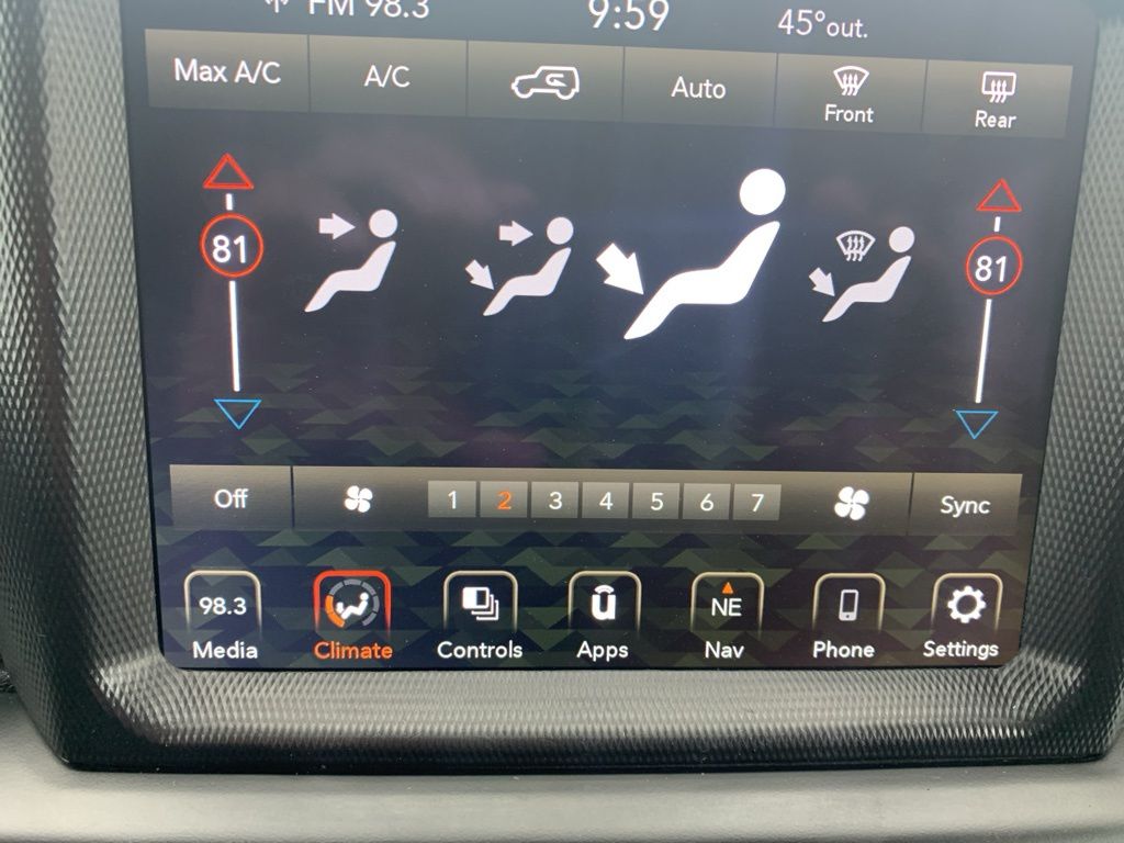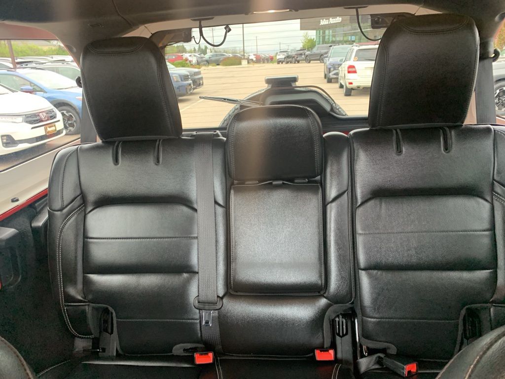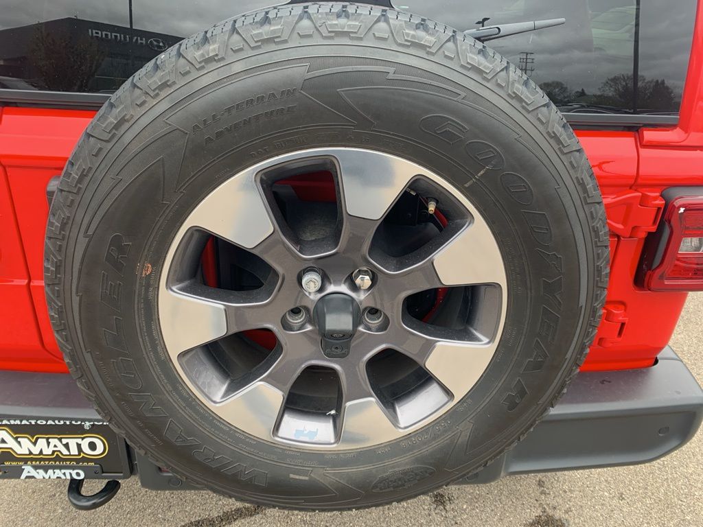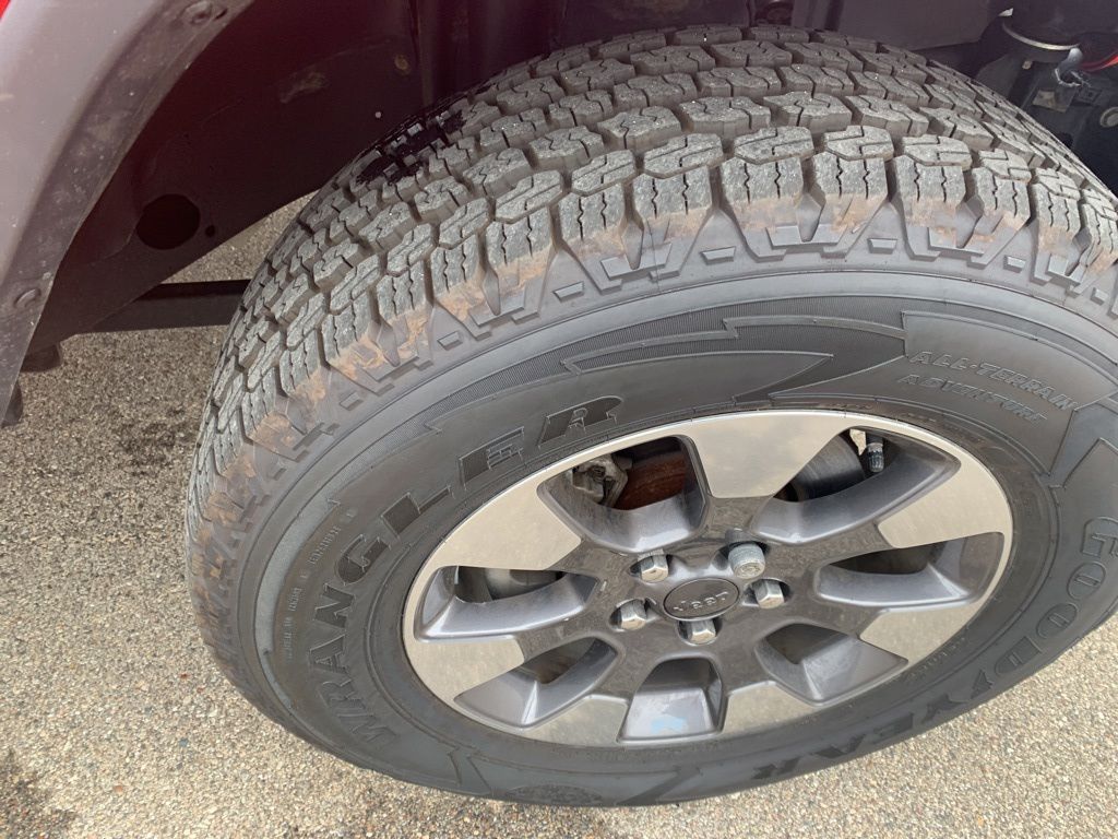 The exterior features body-color accents, 18-inch technical grey aluminum wheels with all-terrain tires, LED taillamps, deep-tinted glass, heated power mirrors, and both a Black Freedom Top 3-piece hardtop and Black Premium Sunrider soft top thanks to the Dual Top Group, giving you flexibility for any season. A full-size rear-mounted spare, swing-out rear cargo access, and rugged Jeep styling complete the look.