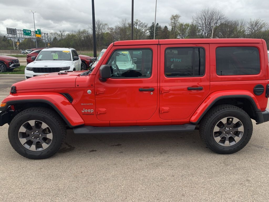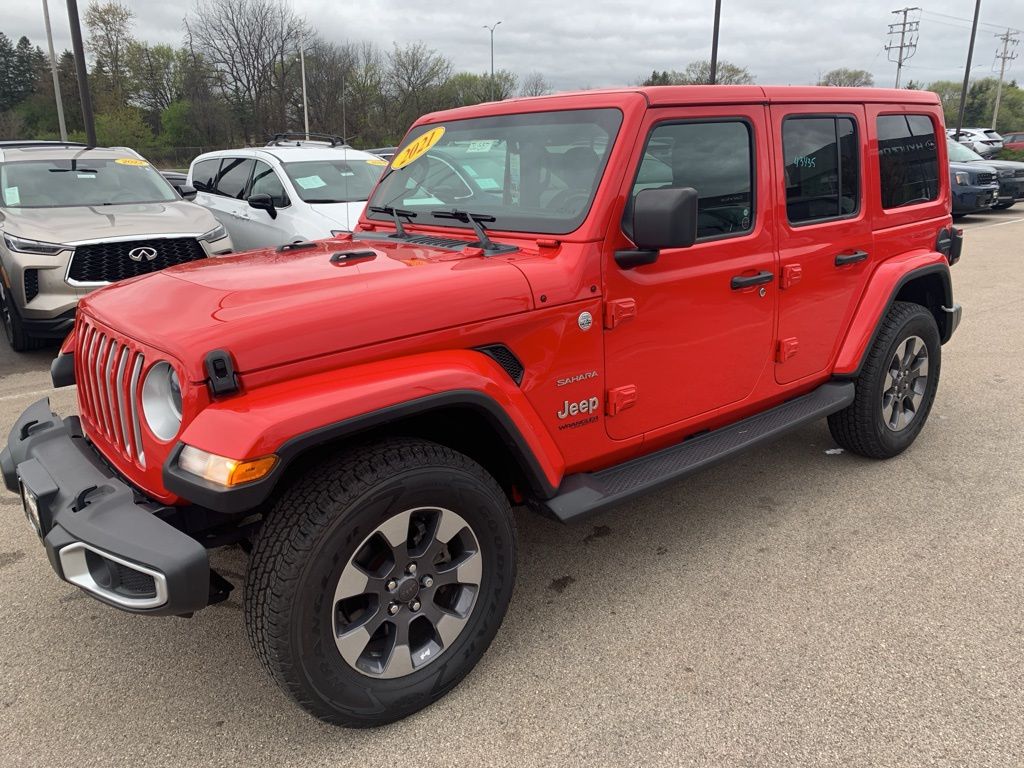 This 2021 Jeep Wrangler Unlimited Sahara 4x4 stands out in Firecracker Red with a Black interior and delivers iconic Jeep capability paired with everyday comfort. Powered by the efficient 2.0L turbocharged four-cylinder engine with stop/start technology and an 8-speed automatic transmission, this Wrangler offers confident performance on-road and off-road, supported by a part-time four-wheel-drive system, Selec-Speed Control, heavy-duty suspension, skid plates, and trailer sway control.