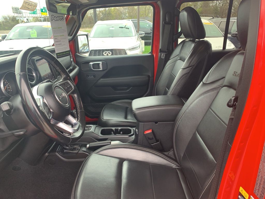 Inside, the cabin is equipped with leather-faced seats with Sahara logos, a leather-wrapped steering wheel, dual-zone automatic climate control, remote start, garage door transmitter, and a configurable driver information display. Technology highlights include the Uconnect 4C navigation system with an 8.4-inch touchscreen, Apple CarPlay and Android Auto integration, Alpine premium audio system, 4G LTE Wi-Fi hotspot capability, SiriusXM services, and multiple USB and 12V power outlets.