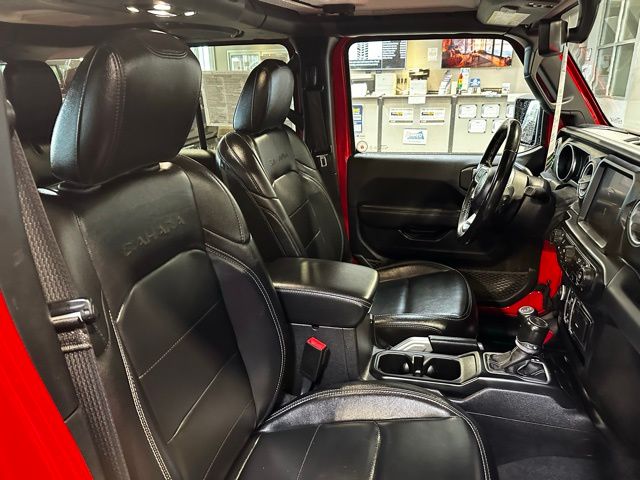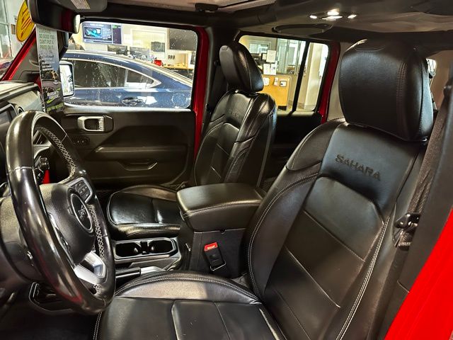 Inside, the cabin is equipped with leather-faced seats with Sahara logos, a leather-wrapped steering wheel, dual-zone automatic climate control, remote start, garage door transmitter, and a configurable driver information display. Technology highlights include the Uconnect 4C navigation system with an 8.4-inch touchscreen, Apple CarPlay and Android Auto integration, Alpine premium audio system, 4G LTE Wi-Fi hotspot capability, SiriusXM services, and multiple USB and 12V power outlets.