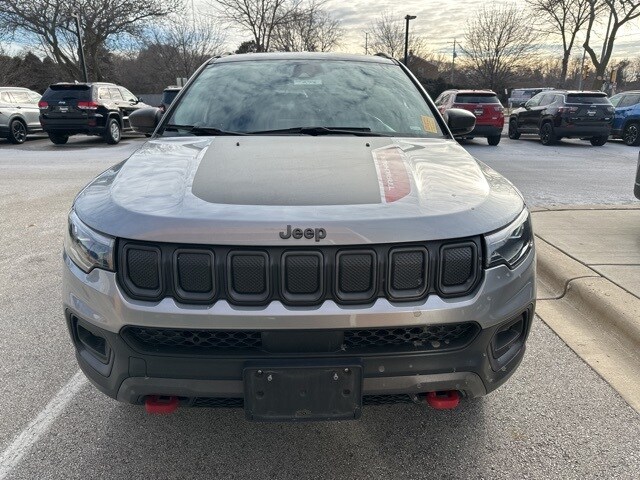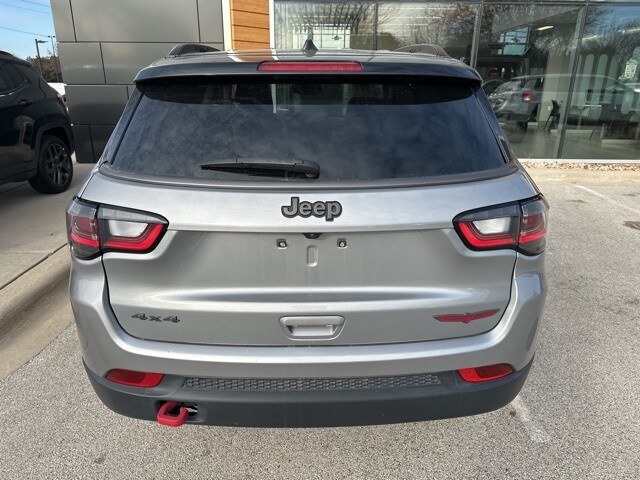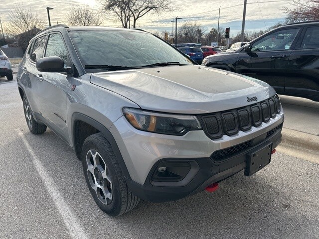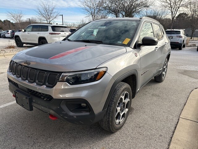 This 2022 Jeep Compass Trailhawk 4x4 is finished in Billet Silver Metallic Clearcoat with a Ruby Red and Black interior, delivering a rugged design paired with Trailhawk-specific off-road capability. The exterior features 17-inch painted diamond-cut aluminum wheels, on/off-road all-season tires, LED low- and high-beam projector headlamps, premium LED fog lamps, a black grille, roof rails, deep-tinted glass, cornering lights, and perimeter approach lighting. Additional functional touches include a power liftgate with foot-activated Open n Go, rain-sensing wipers, premium taillamps, a rear window wiper and defroster, and a full-size spare tire mounted under the cargo area.