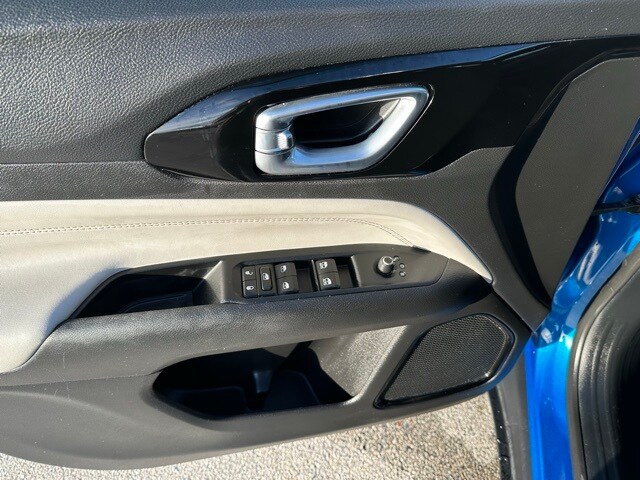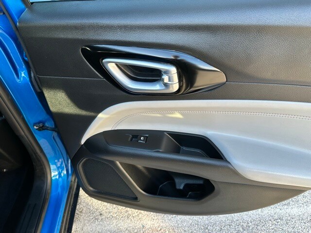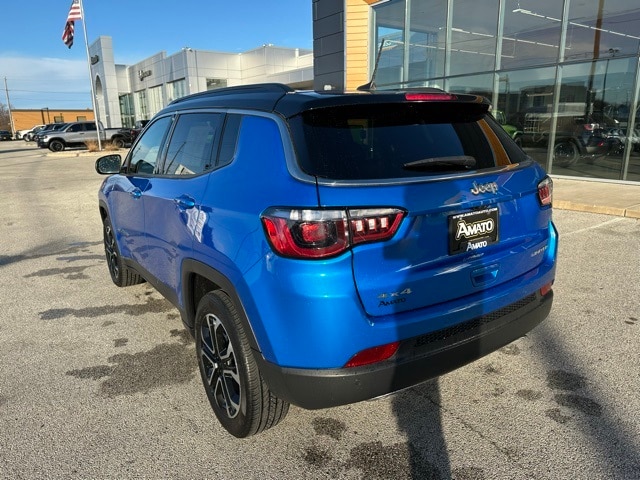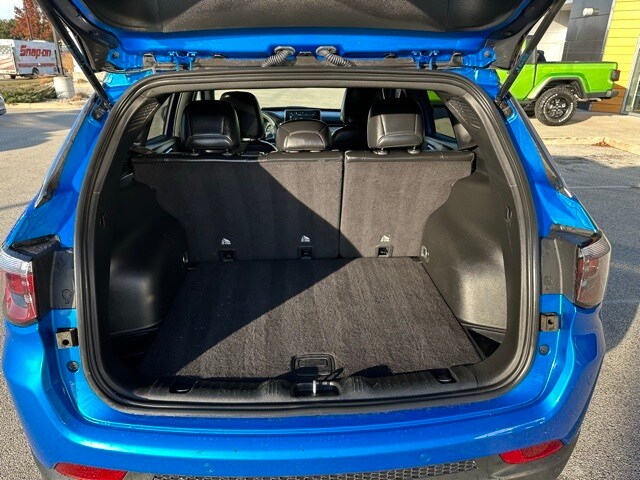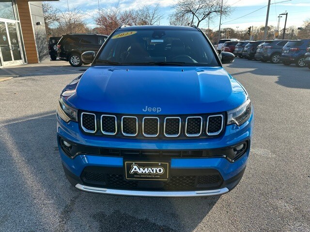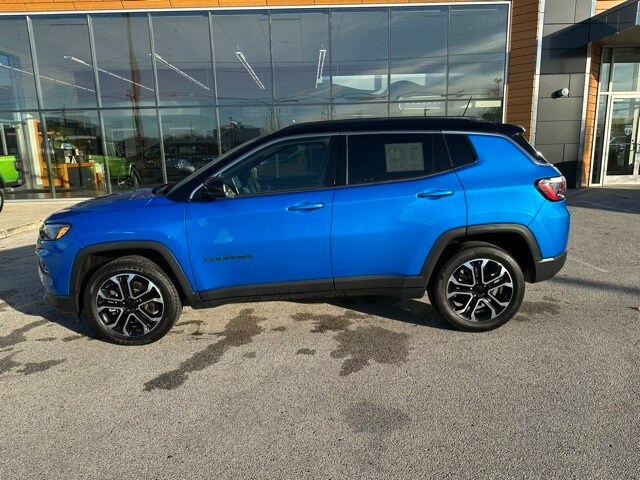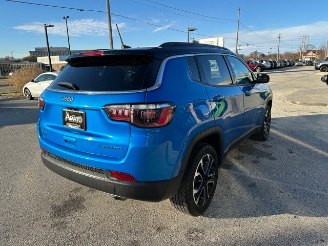 The 2023 Jeep Compass Limited 4x4 stands out boldly in Laser Blue Pearlcoat, giving the SUV a modern and sporty presence on the road. Its exterior combines premium touches like chrome window trim, a refined black/chrome grille, and sleek body-colored bumpers with practical elements such as rain-detecting wipers, heated mirrors, LED cornering lights, and a dual hidden exhaust. Deep-tinted glass, roof rack rails, and a subtle rear lip spoiler round out a look that balances rugged capability with upscale sophistication.