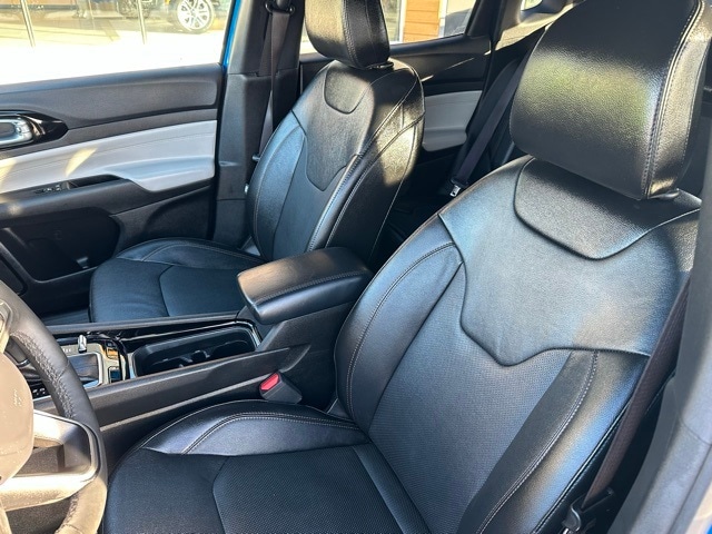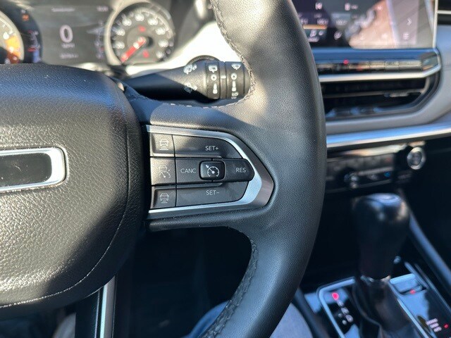 Inside, the Compass Limited delivers a polished and technology-focused cabin dressed in Black interior trim. A large 10.1-inch touchscreen with Uconnect 5, smart device integration, and a digital/analog driver information center give the interior a modern feel. Comfort comes standard with heated leather/metal-look steering wheel, dual-zone automatic climate control, sliding center armrest, and leather-trimmed seats. Practical touches like multiple storage pockets, concealed cargo space, illuminated cupholders, and a full set of carpeted mats make everyday use easy while maintaining a premium vibe.