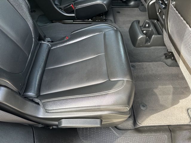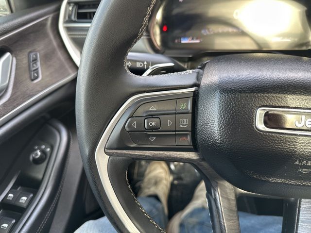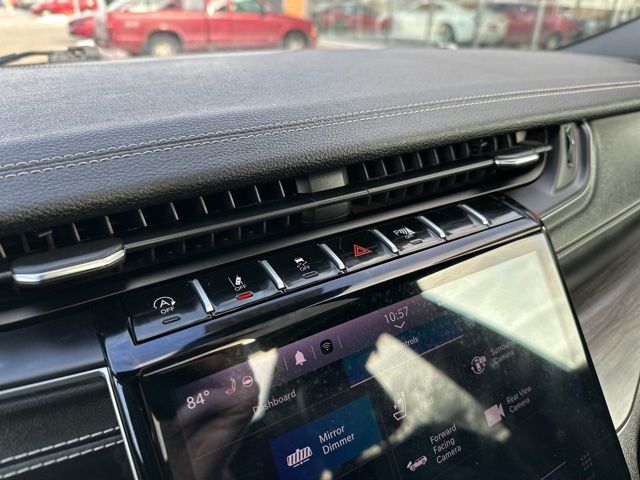 Inside, the Grand Cherokee L offers a spacious and upscale cabin with Capri leatherette seating, ventilated front seats, a heated leatherette steering wheel, power tilt-and-telescoping steering column with memory, and a full-length dual-pane panoramic sunroof. Comfort and convenience are enhanced by dual-zone automatic climate control, a garage door transmitter, wireless charging pad, second-row window shades, multiple USB and power outlets including a 120V outlet, and ample storage throughout all three rows.