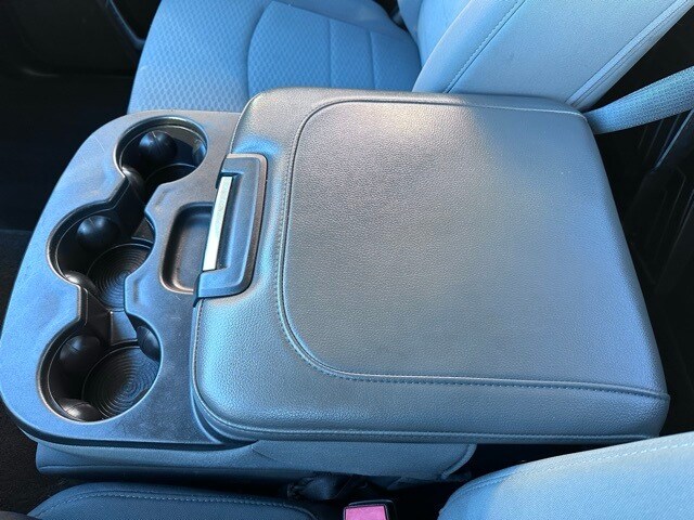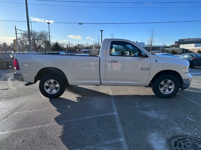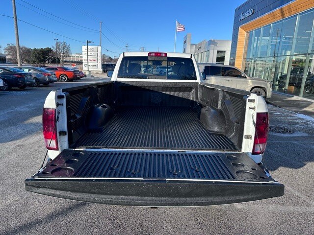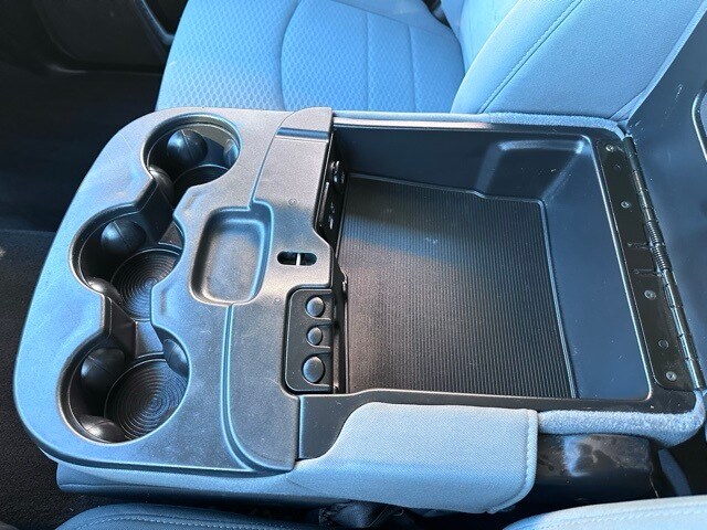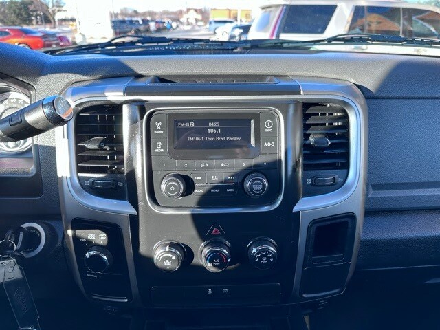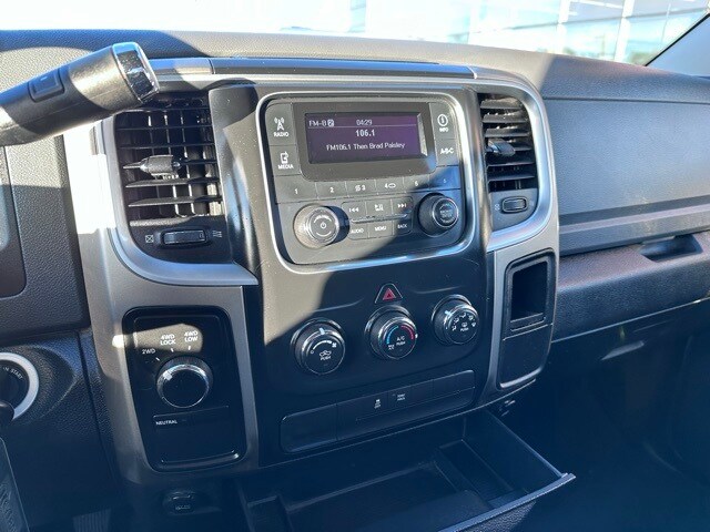 Inside the cab, the RAM features a 40/20/40 cloth split bench seat with a column-mounted shifter and front armrest with integrated cupholders. The interior is equipped with air conditioning, power windows, speed control, tilt steering column, overhead console, behind-the-seat storage bin, and a driver information center with trip computer, temperature, and compass display. Additional conveniences include a Media Hub with USB and auxiliary input, Uconnect 3.0 AM/FM audio system, six speakers, and power accessory delay.