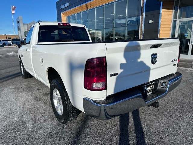 This 2013 RAM 1500 SLT 4x4 Regular Cab is finished in Bright White Clearcoat with a Diesel Gray and Black interior, offering a clean, work-ready appearance with practical features throughout. The exterior includes a bright chrome grille, bright front and rear bumpers, automatic quad-beam halogen headlamps, tinted glass, a locking tailgate, cargo bed lighting, and 17-inch aluminum wheels wrapped in all-season tires. A rear sliding window, heated exterior mirrors, active grille shutters, and a full-size spare tire add everyday usability.