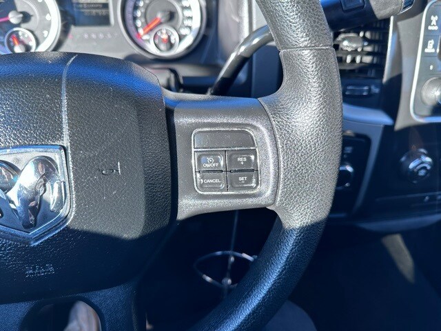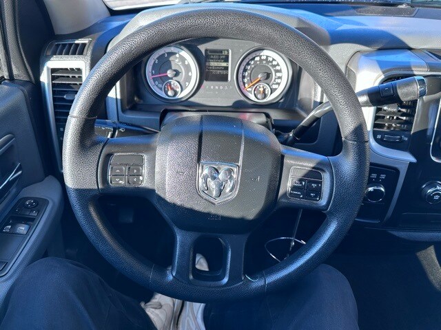 Safety equipment includes electronic stability control, front and side-impact airbags, front side-curtain airbags, a tire pressure monitoring system with display, multistage front airbags, and a Sentry Key theft deterrent system. This RAM 1500 SLT delivers dependable V8 power, four-wheel-drive capability, and a straightforward interior layout suited for both job site duty and everyday driving.